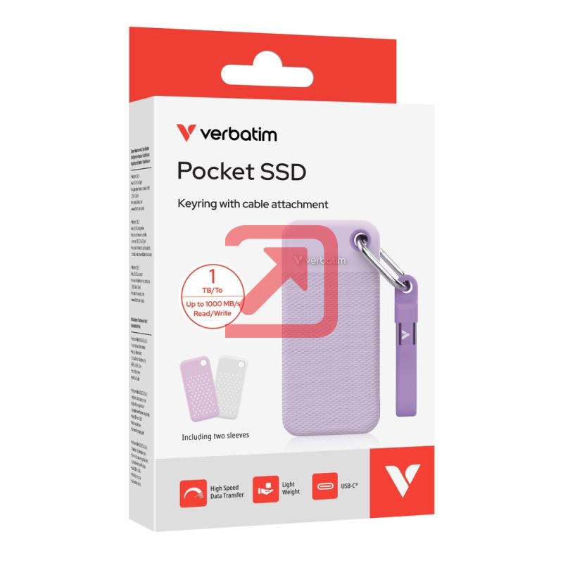 Начало Офис техника Информационни носители USB памети Твърд диск Verbatim Pocket SSD USB 3.2 Gen 2 1TB Purple incl. two rubber sleeves